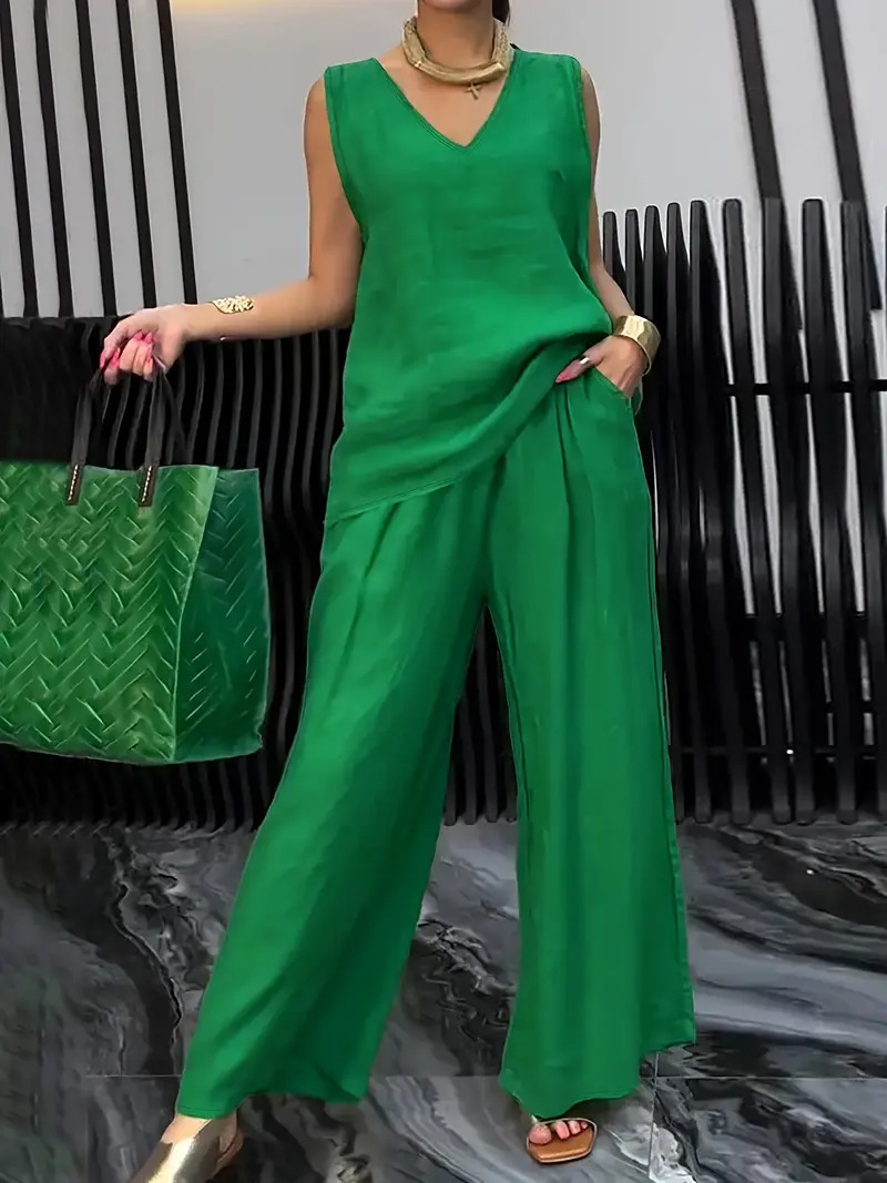 Stylowy top bez rękawów z dekoltem w kształcie litery V - top został zaprojektowany z dekoltem w kształcie litery V, który wydłuża dekolt i podkreśla elegancką sylwetkę szyi i ramion. Sylwetka bez rękawów dodaje prostego, ale swobodnego i swobodnego charakteru do ogólnego wyglądu.